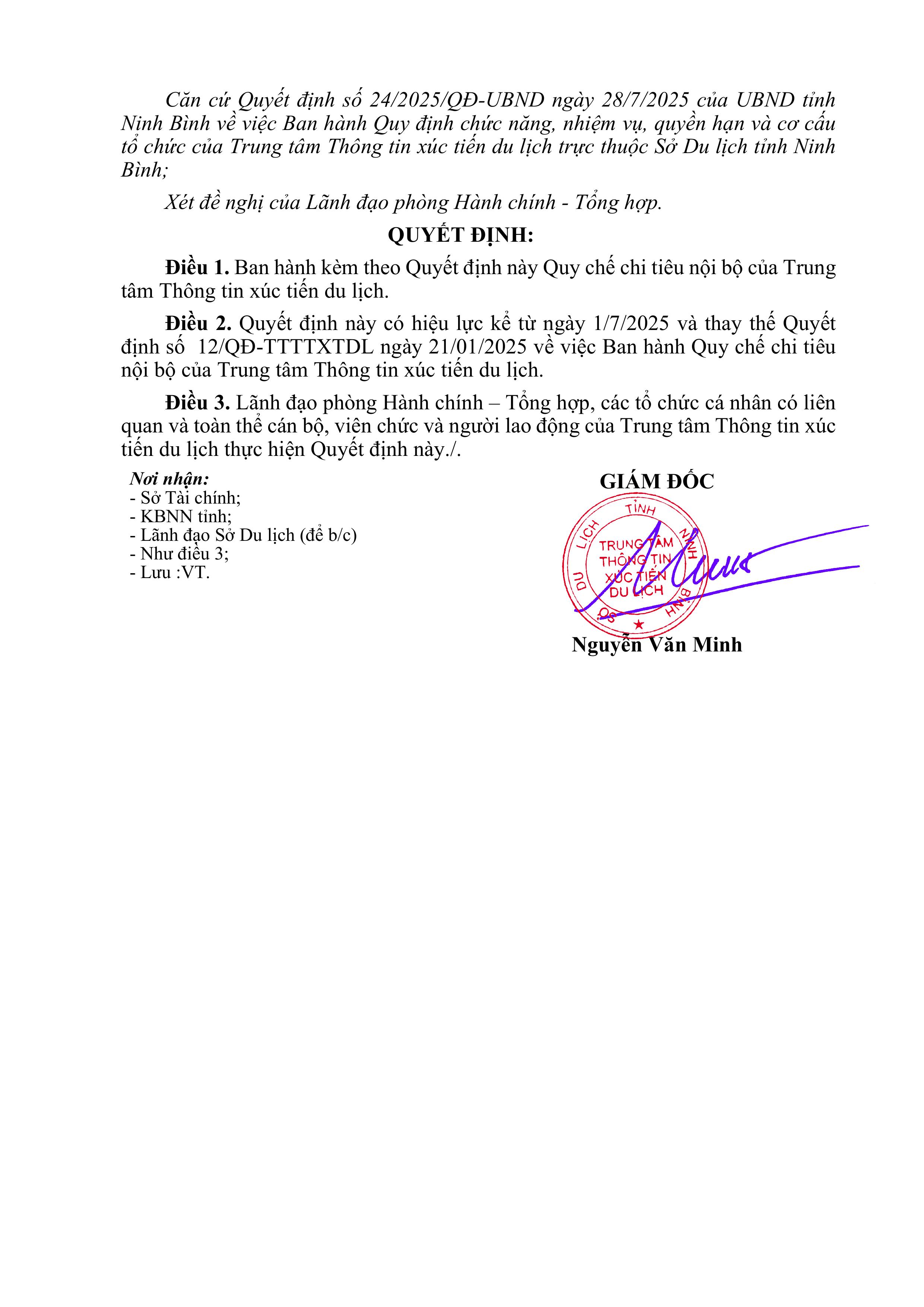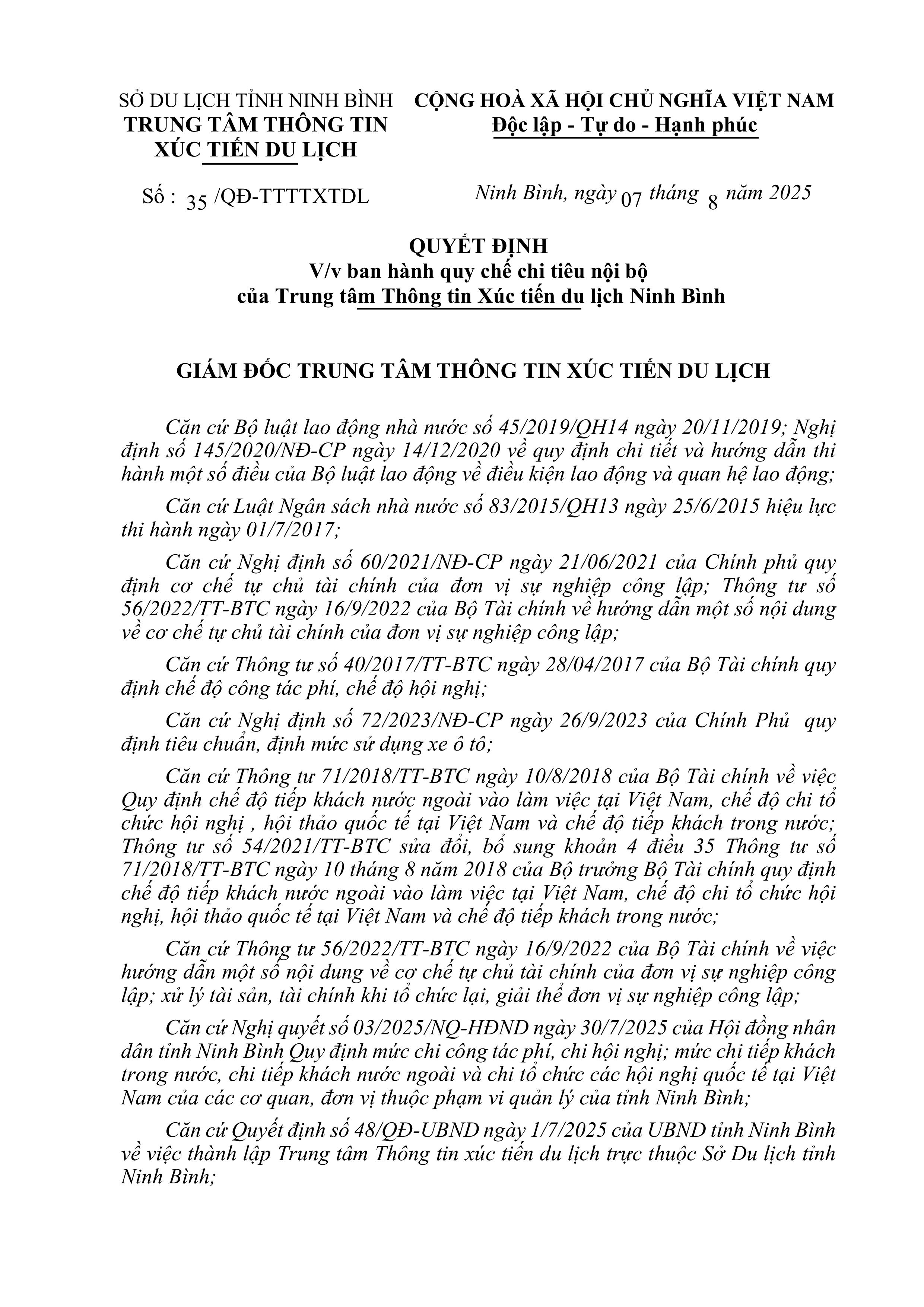QUYẾT ĐỊNH V/v ban hành quy chế chi tiêu nội bộ của Trung tâm Thông tin Xúc tiến du lịch Ninh Bình