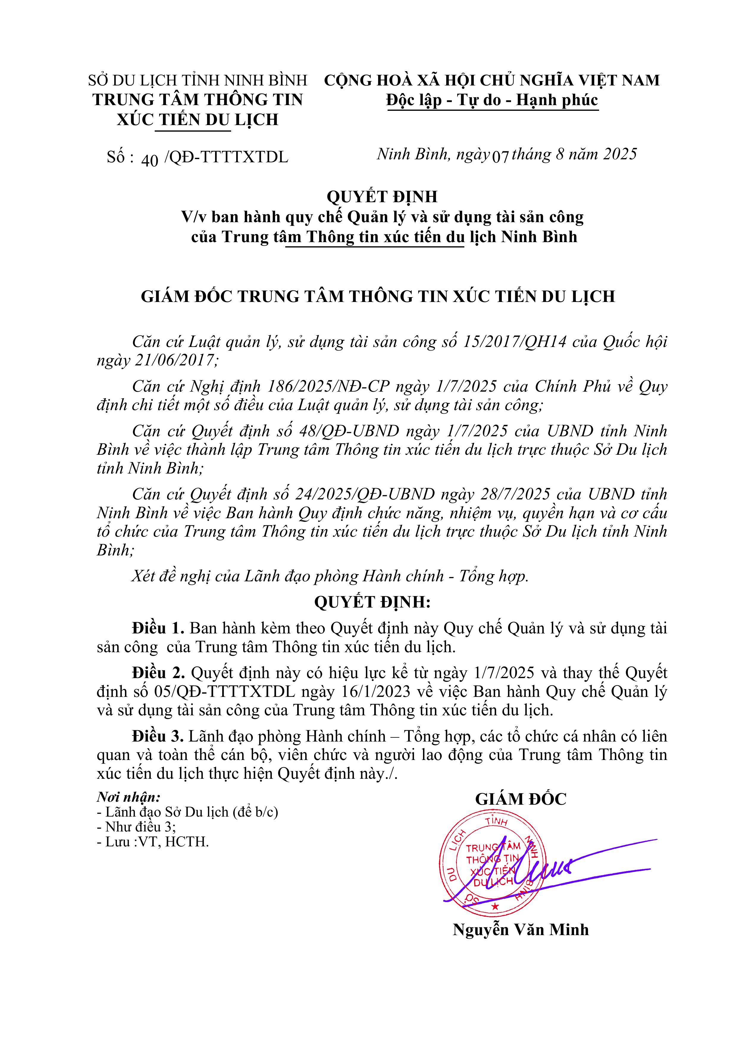 Quyết định về việc công bố công khai tình hình mua sắm tài sản công năm 2024 của Trung tâm Thông tin Xúc tiến Du lịch Ninh Bình
