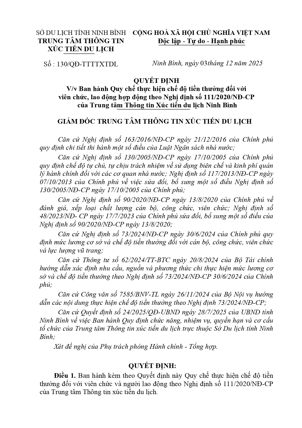 QUYẾT ĐỊNH V/v Ban hành Quy chế thực hiện chế độ tiền thưởng đối với viên chức, lao động hợp động theo Nghị định số 111/2020/NĐ-CP của Trung tâm Thông tin Xúc tiến du lịch Ninh Bình