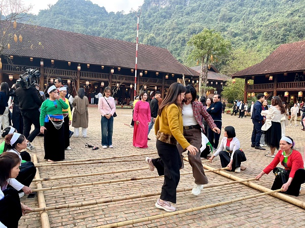 Par ailleurs, Thung Ui recrée également l’espace culturel traditionnel du peuple Mường à travers des maisons sur pilotis typiques et diverses activités culturelles lors des fêtes, telles que la danse du bambou (nhảy sạp), les jeux traditionnels ou la marche sur échasses, offrant ainsi aux visiteurs des expériences culturelles riches et authentiques.
