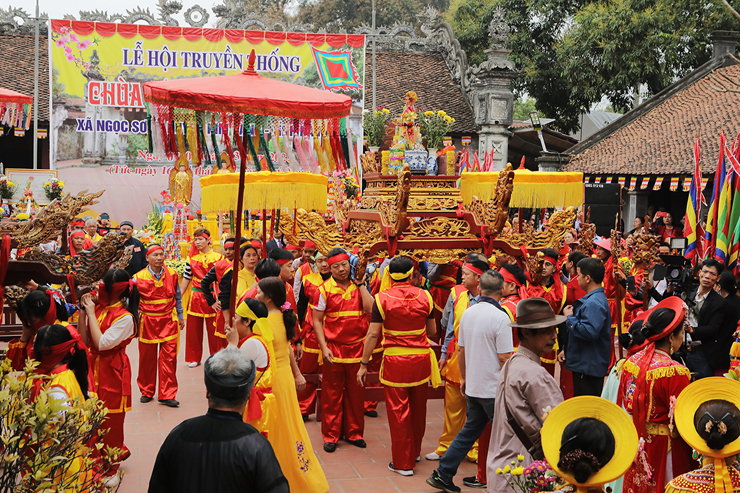 Mở đầu lễ hội là nghi thức rước kiệu trang trọng. Đoàn rước trong trang phục truyền thống rực rỡ, cờ hội tung bay, tiếng trống chiêng vang vọng khắp không gian làng quê tạo nên bầu không khí linh thiêng mà rộn ràng. Kiệu được rước quanh khu vực di tích, tái hiện nét đẹp văn hóa cổ truyền của cư dân vùng đồng bằng Bắc Bộ. Khi đoàn rước hội tụ trước sân chùa, nghi thức dâng hương và tế lễ được cử hành trang nghiêm, thể hiện lòng thành kính và sự tri ân đối với các bậc tiền nhân.