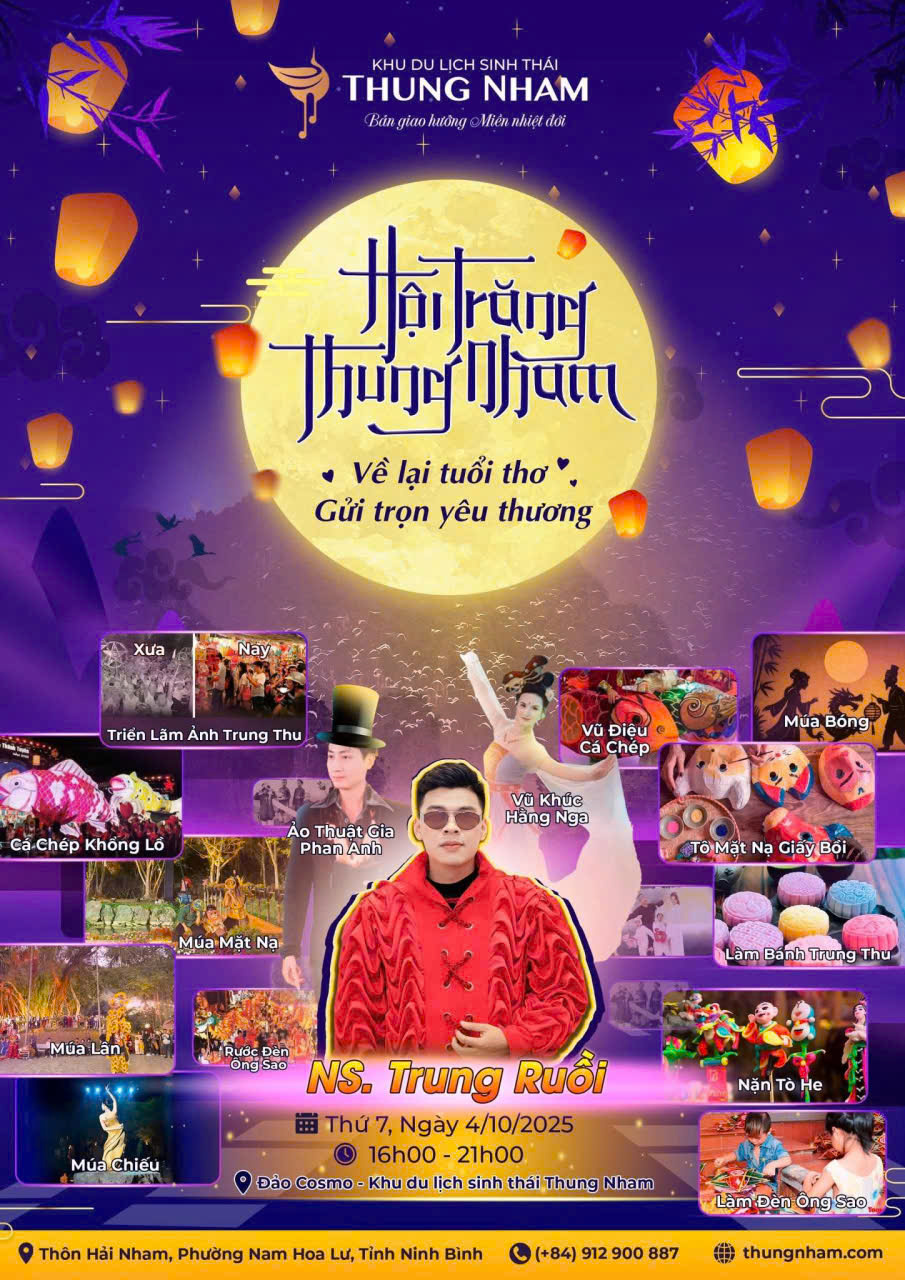 1. Hội trăng Thung Nham: “Trở về tuổi thơ – Gửi trọn yêu thương”: Chương trình mang chủ đề “Về lại tuổi thơ – Gửi trọn yêu thương” với nhiều hoạt động đặc sắc như múa lân, múa rối, múa mặt nạ, triển lãm ảnh Trung thu, làm đèn ông sao, nặn tò he, làm bánh Trung thu... Đặc biệt, khán giả sẽ được thưởng thức các tiết mục nghệ thuật ấn tượng cùng sự góp mặt của nghệ sĩ Trung Ruồi và ảo thuật gia Phan Anh. Đây sẽ là đêm hội rực rỡ, gắn kết yêu thương và lưu giữ những kỷ niệm tuổi thơ trọn vẹn. Chương trình được tổ chức vào lúc 16h00 – 21h00 thứ 7 ngày 4/10/2025 tại Đảo Cosmo – Khu du lịch sinh thái Thung Nham, phường Tây Hoa Lư.