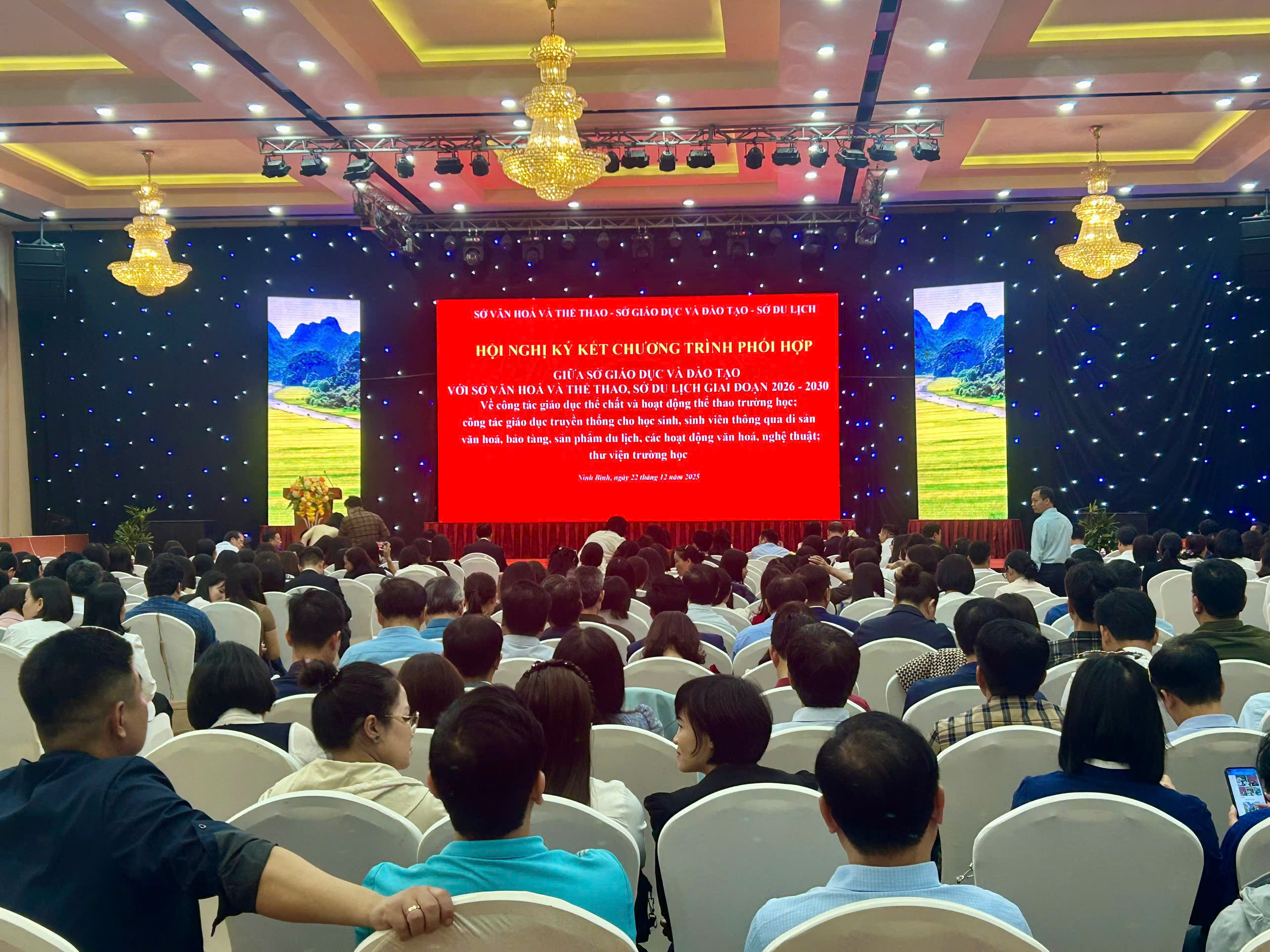 Ngày 22/12/2025, tại Khách sạn The Reed (phường Hoa Lư), Sở Giáo dục và Đào tạo phối hợp với Sở Văn hóa và Thể thao, Sở Du lịch tổ chức Hội nghị ký kết Chương trình phối hợp giai đoạn 2026 – 2030, nhằm tăng cường hiệu quả công tác giáo dục toàn diện cho học sinh, sinh viên thông qua các hoạt động văn hóa, thể thao và du lịch.