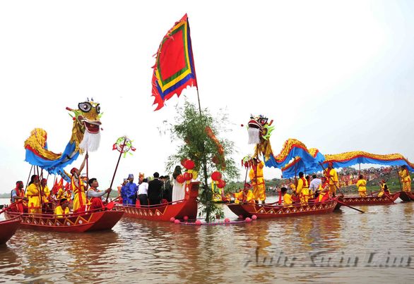 Khi đoàn rước ra tới bến sông Hoàng Long thì hương án có đặt bình sứ được đưa xuống thuyền trước tiên, sau đó là rồng vàng, sư tử và đoàn người rước xuống thuyền. Tiết khí trời buổi sớm mai tại không gian sông nước mênh mông càng tăng thêm tính linh thiêng, độc đáo như hồi tưởng lại lịch sử nghìn năm về trước. Vị chủ lễ trịnh trọng đọc bản sớ trình xin rước nước, cùng các “quần thần” đốt hoá bản sớ trình, thả xuống dòng sông. Xin nước sông đổ vào bình sứ để đưa lên kiệu rước trở về đền vua Đinh trước khi làm lễ dâng hương.